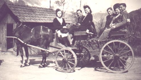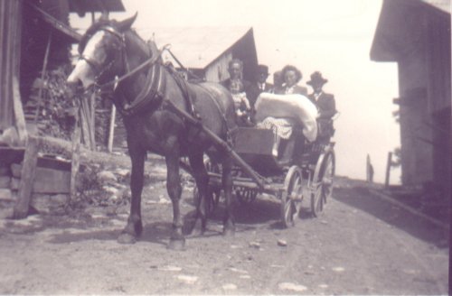 Suisse avec cette caractéristique baie claire. A cette époque, le cheval de la ferme travaillait tous les jours de l'année. Les grands jours, il tirait le char à banc et le reste du temps il participait aux travaux de la ferme et des champs en tirant le char " échelle ", à " teston " c'est à dire à tas de foin. Il existait aussi le char à banc bétaillère qui pouvait contenir jusqu'à 11 veaux ou cochons. |